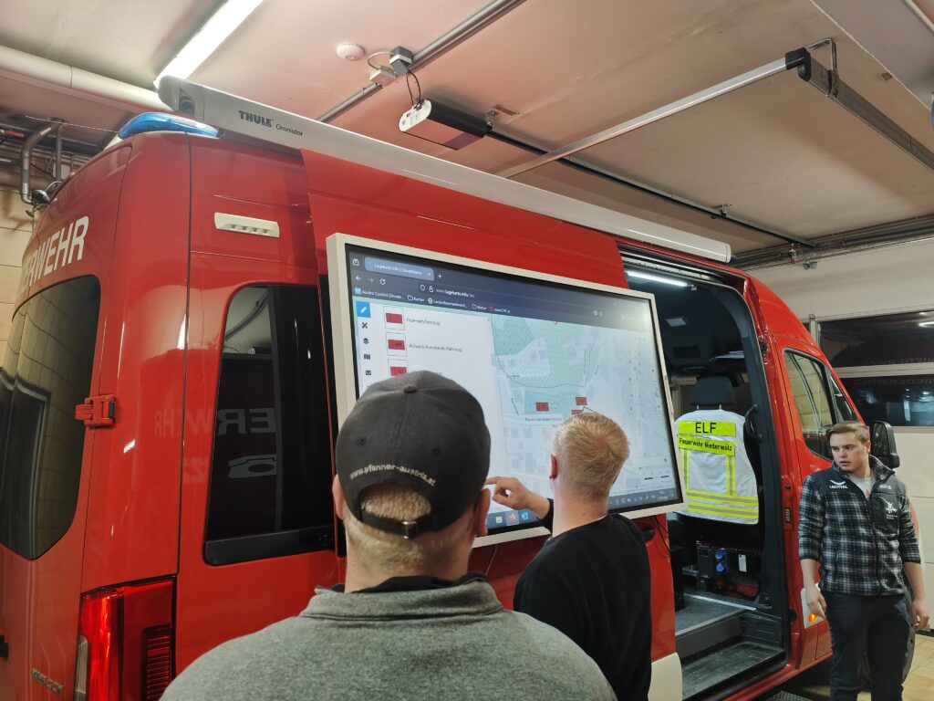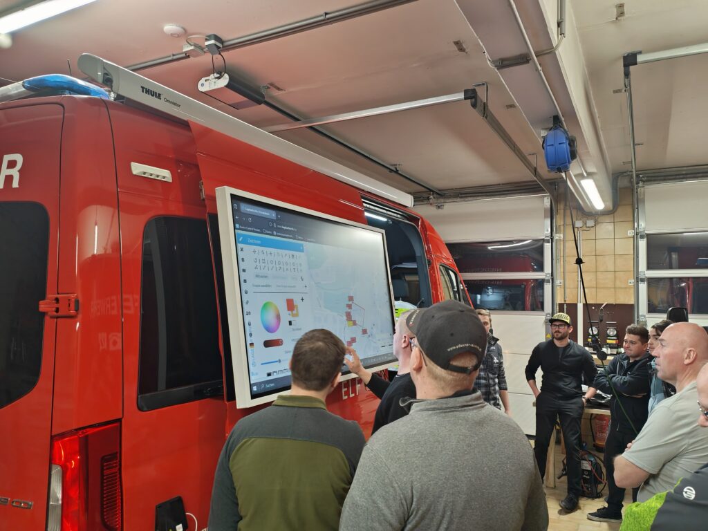 LM d.V. Maximilian HORN vertiefte den Einsatzfall mit unserem Einsatzleitfahrzeug ELF, insbesondere hinsichtlich Einsatzablauf sowie Lageführung und Einsatzleitung besprochen. Praktisch beübt wurde der Umgang mit der interaktiven, digitalen Lagekarte.